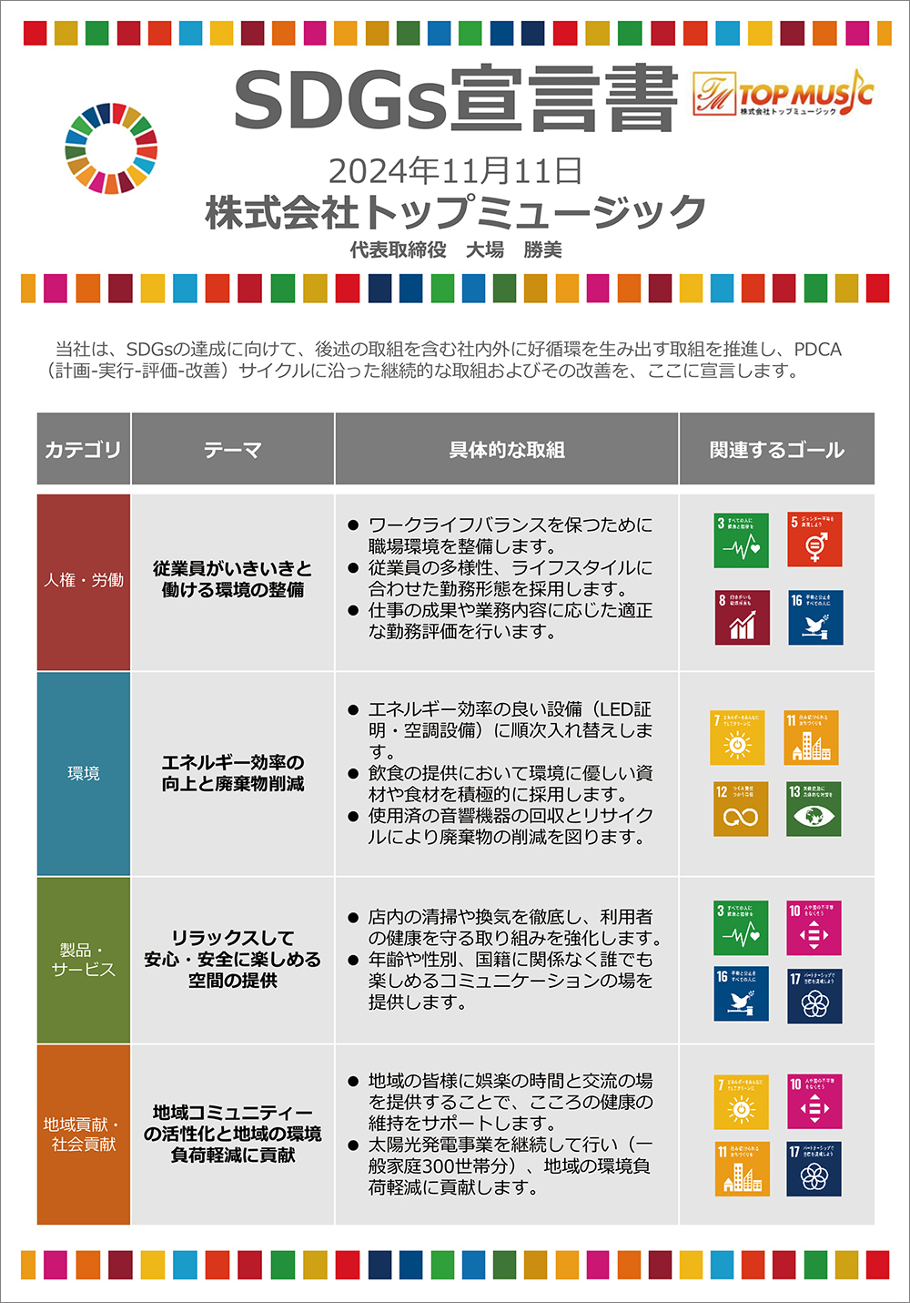 | 目的 | 【1】音響機器の賃貸、及び販売 【2】カラオケルームの経営 【3】音響、及び映像機器システムの企画及び販売 【4】自然再生エネルギー事業 【5】インターネット業務 【6】前各号に付帯する一切の業務 |